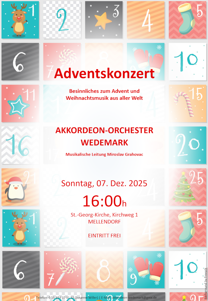 Im Rahmen des Weihnachtszauber der Kirchengemeinde St. Georg in Mellendorf lädt das Akkordeon-Orchester Wedemark e.V. unter der Leitung von Miroslav Grahovac alle Freunde der Akkordeonmusik wieder recht herzlich zu einem vorweihnachtlichen Musikerlebnis ein.