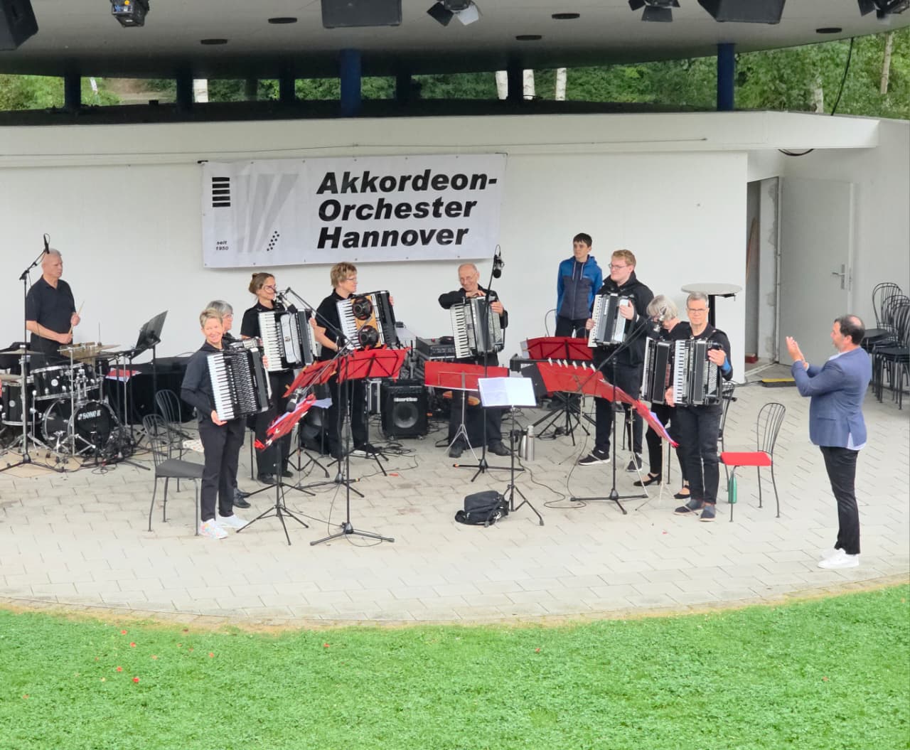 Bei etwas Regen am Vormittag und anschl. Sonnenschein boten am 17. August das Akkordeon-Orchester Hannover und vier befreundete Akkordeon-Orchester aus der Hannover und Umgebung den zahlreichen Zuschauern 5 Stunden mitreißende Akkordeon-Musik. Im Stundentakt spielten ab 11.00 Uhr das Akkordeon-Orchester Wedemark, das Akkordeon Kammerorchester Hannover, der Hohner Ring Burgdorf, die Langenhagener Akkordeonfreunde und zuletzt das einladende Akkordeon-Orchester Hannover auf der überdachten Bühne im wunderschönen Park der Sinne.